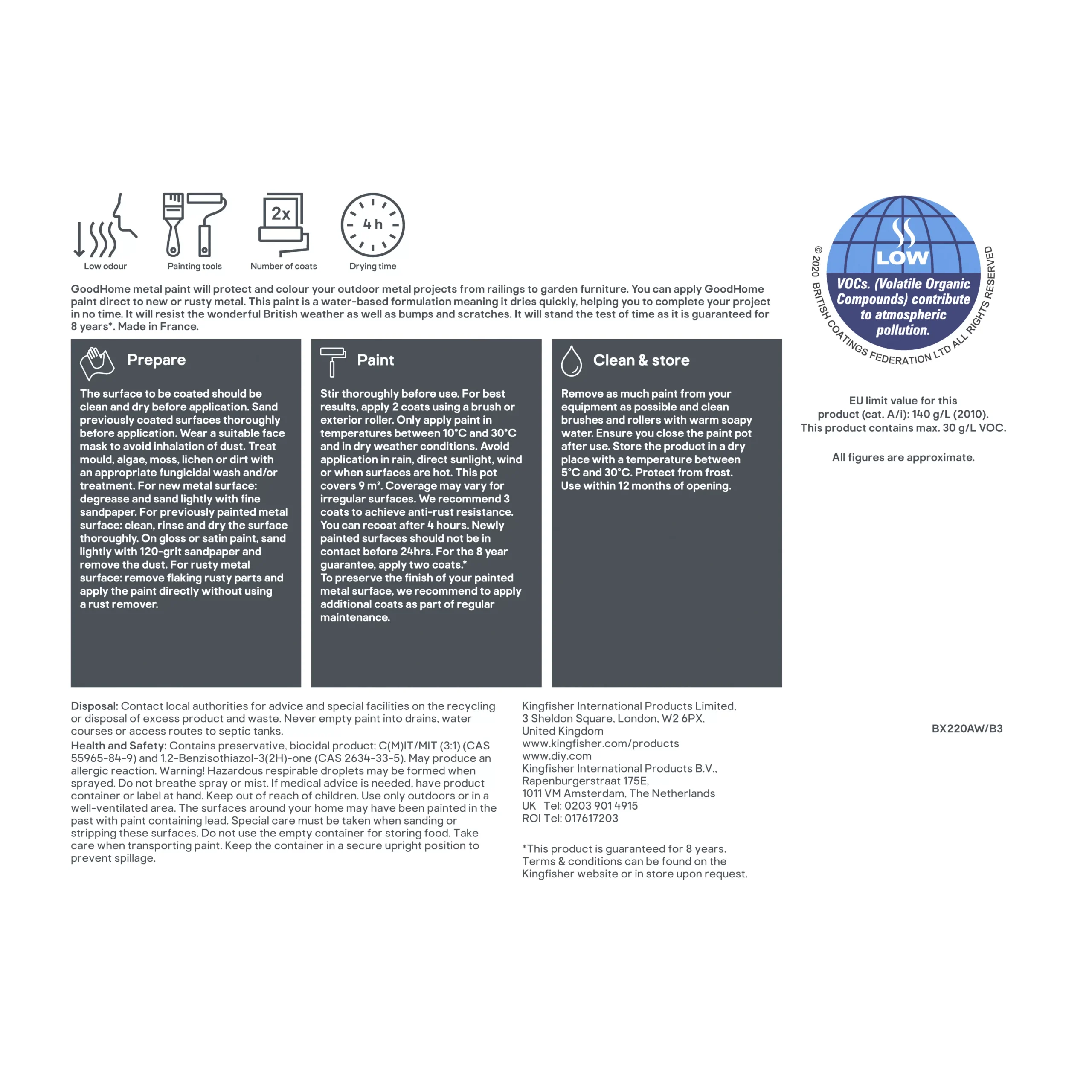 This gloss metal paint from the GoodHome Outdoor range is the perfect choice to renew your home exterior. Made to provide a rich, durable finish, you can be sure that this paint will look brilliant for longer. Black is a versatile colour that will suit any exterior design. The paint can be applied on ferrous and non-ferrous metal surfaces. Use this metal paint to create an effortlessly gloss finish with easy application and minimal cleanup. This 750ml tin will cover up to 9 m² on average. For the best outcome, apply using a brush or roller. This paint needs 2 coats to look its best, but its quick drying formula makes up for lost time, as you can recoat after just 4 hours. This paint offers top quality protection, designed to be resistant to rust, water, and ultraviolet, making it an ideal choice to use on surfaces outdoors. As well as looking brilliant, this water-based paint is safe for use in your home. It contains minimal VOCs, making it a safe choice for you and your environment.