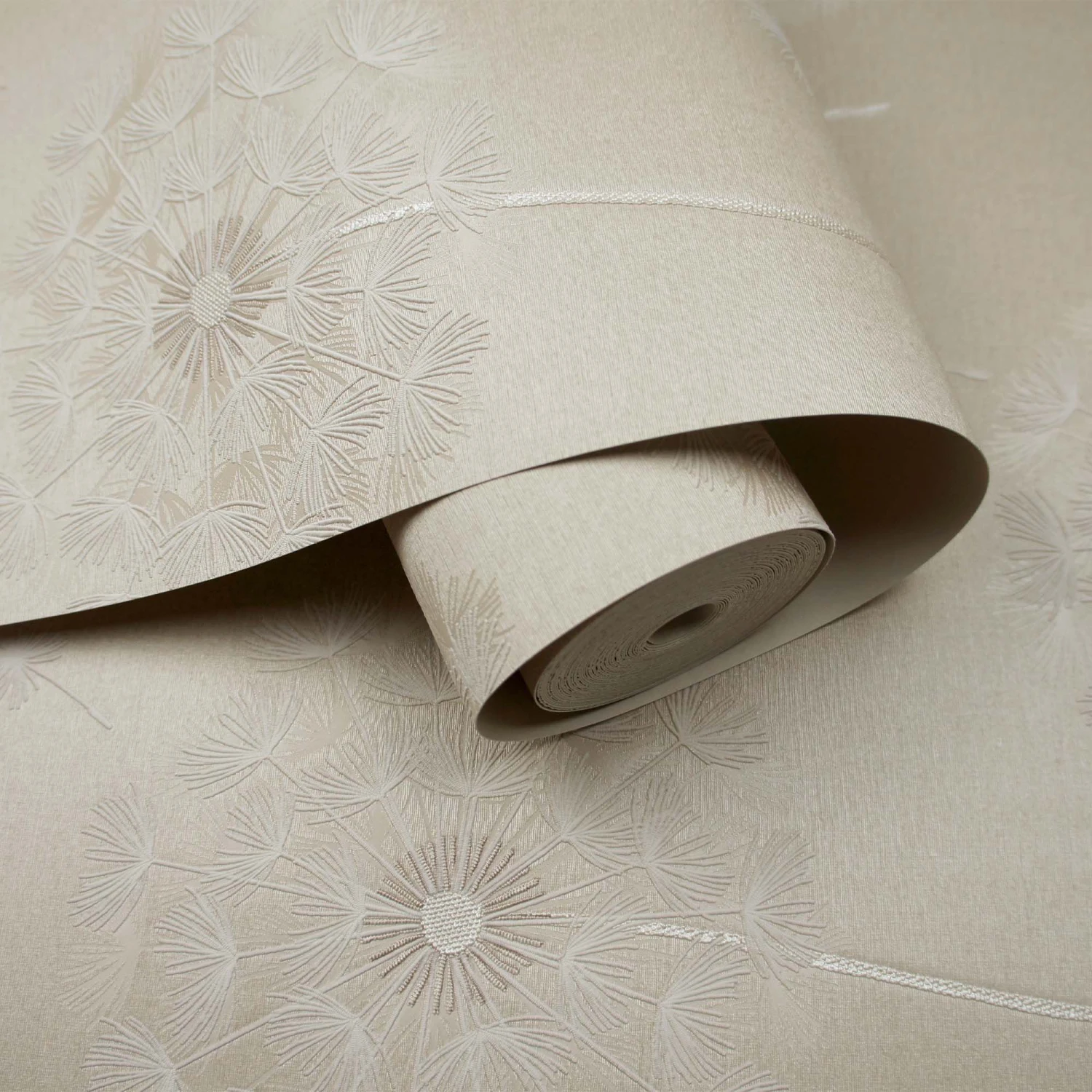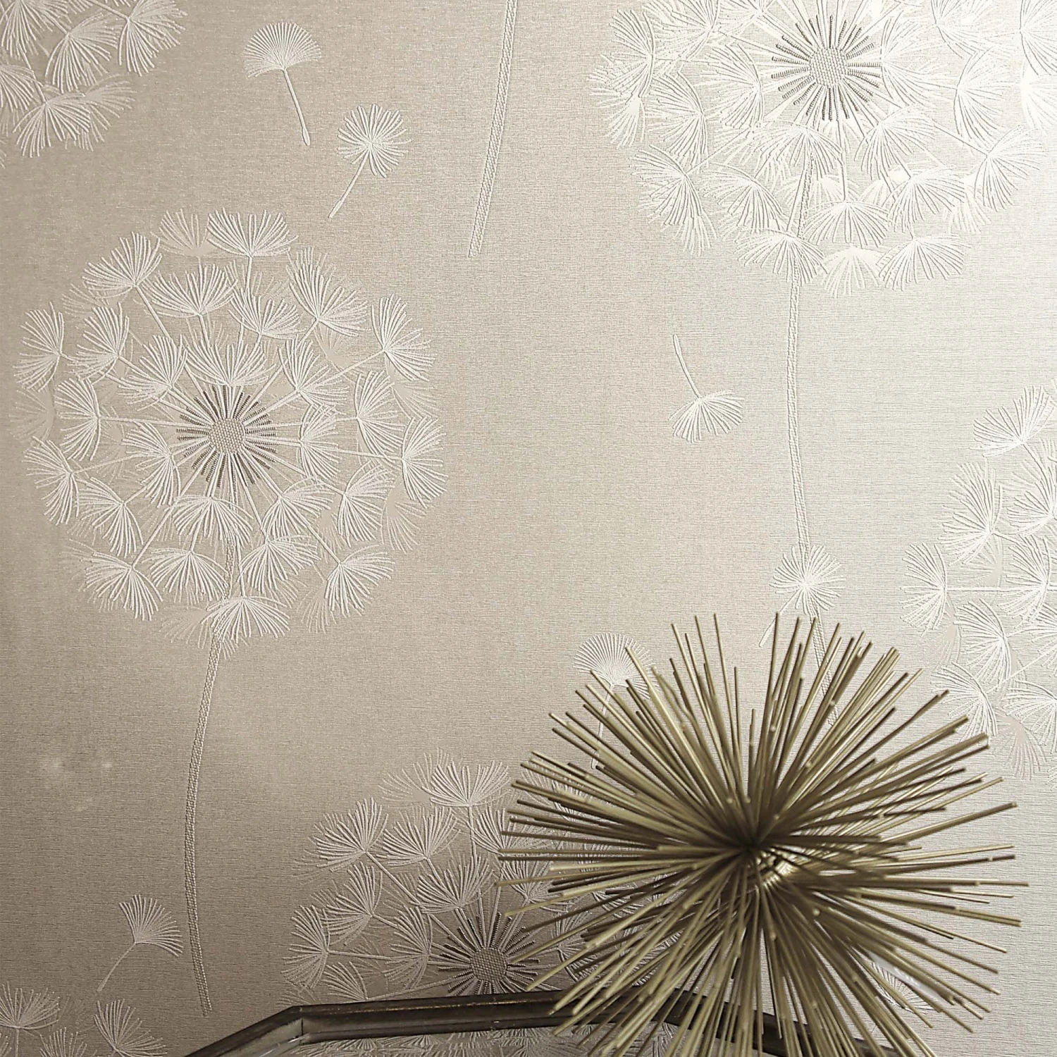 A genuine Italian heavyweight vinyl wallpaper with a luxurious dandelion design inspired by elegant embellished fabrics.